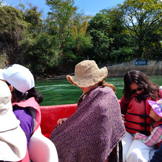 Wir lassen uns Burritos zum Mitnehmen machen und tigern die Gassen, gesäumt von weiteren Souvenirshops zum Fluss hinunter. Dort umschließt uns wieder mehr Gewusel, allerdings touristischer Art. Wir kommen nicht daran vorbei, direkt an einem der Stände unsere Tickets für die Bootsfahrt zu kaufen, und da wir sowieso warten müssen, packen wir die Burritos direkt wieder aus. Und man - sind die lecker, wenn der Teig aus Weizen ist. Es ist unglaublich wie einfach alles in Mexiko irgendwie aus Mais besteht, selbst in die typischen Kakao-Getränke wird Maismehl gerührt und wir haben es im wahrsten Sinne des Wortes satt.